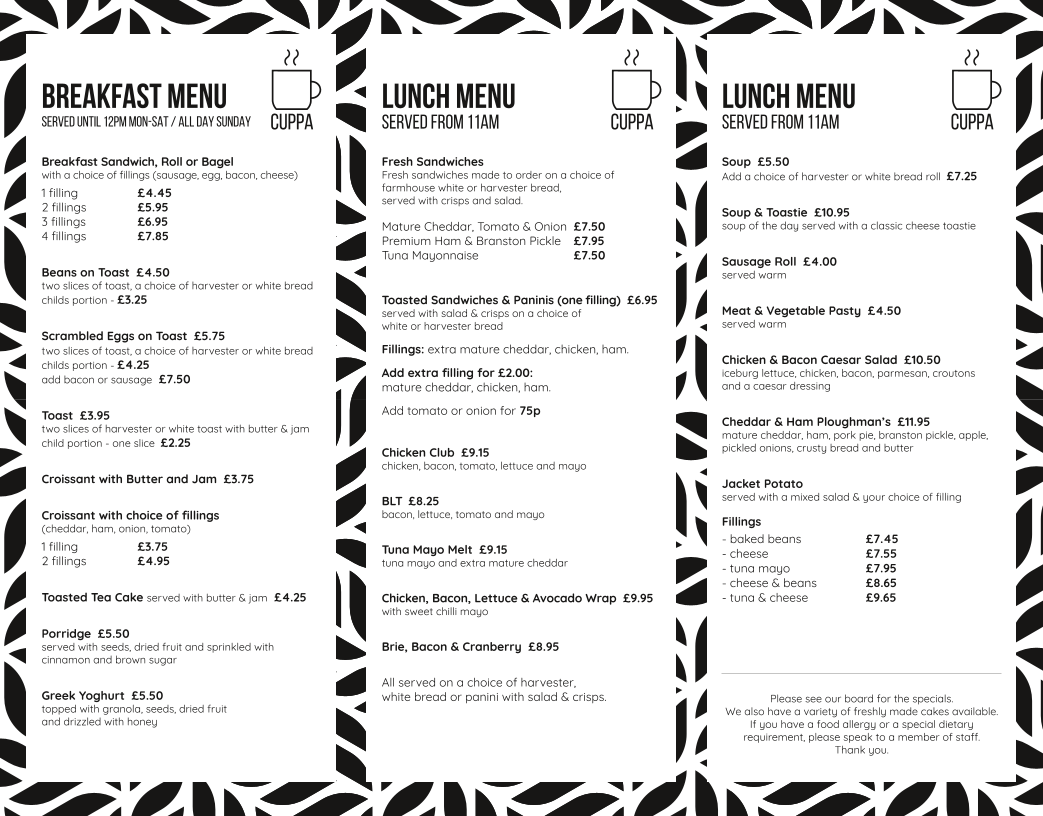 The menu provides a straightforward selection of hot and cold food items along with beverages, catering to customers looking for a quick breakfast, light lunch, or refreshments throughout the day.